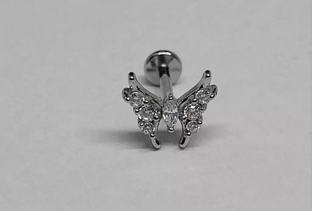 Labret em aço cirúrgico 316L espessura 1,2mm e 8mm de comprimento da haste. Rosca interna. Topo com zircônias.