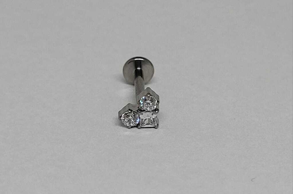 Labret em titânio espessura 1,2mm e 8mm de comprimento da haste. Rosca interna. Topo com zircônias.