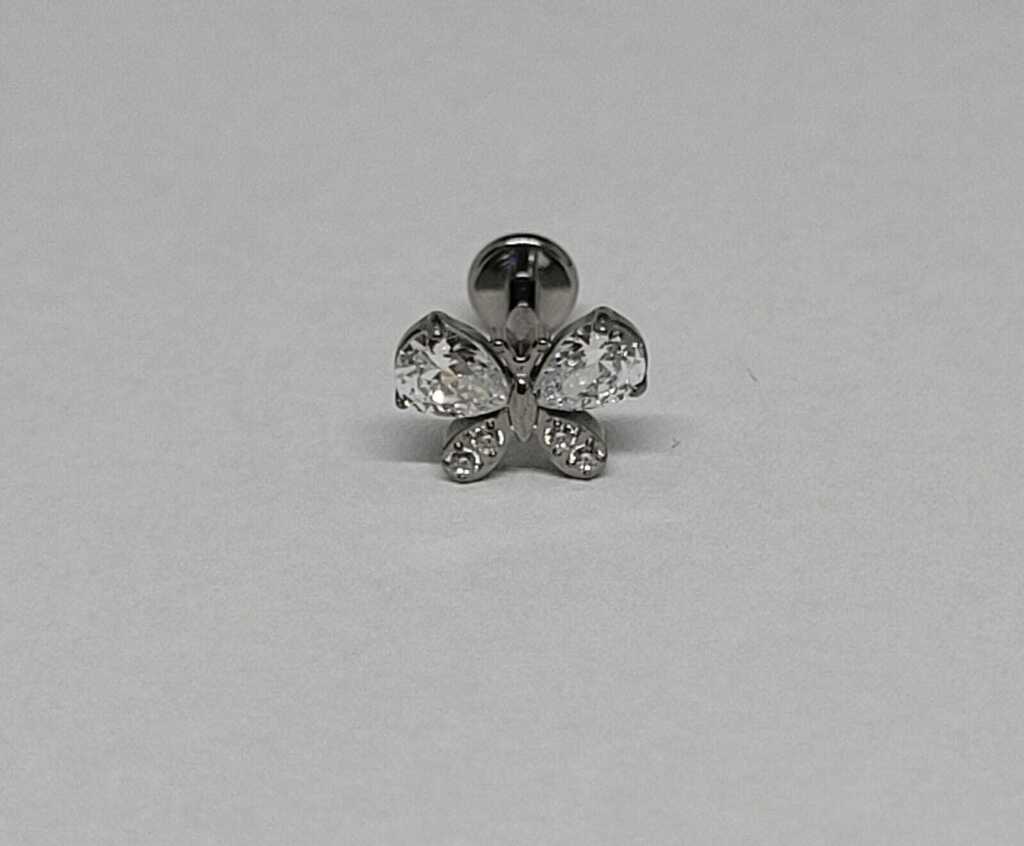 Labret em titânio espessura 1,2mm e 8mm de comprimento da haste. Rosca interna. Topo com zircônias.